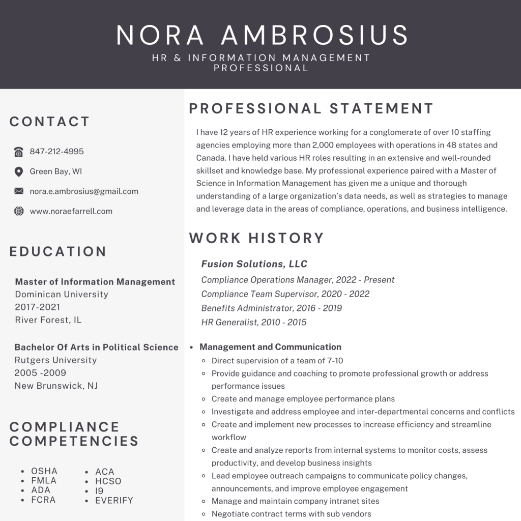 I have 12 years of HR experience working for a conglomerate of over 10 staffing agencies employing more than 2,000 employees with operations in 48 states and Canada. I have held various roles within HR including HR Generalist, Benefits Administrator, Compliance Team Supervisor, and my current role as the Compliance Operations Manager. My numerous roles have facilitated an extensive and well-rounded skillset and knowledge of compliance, operations, benefits, and employee management.