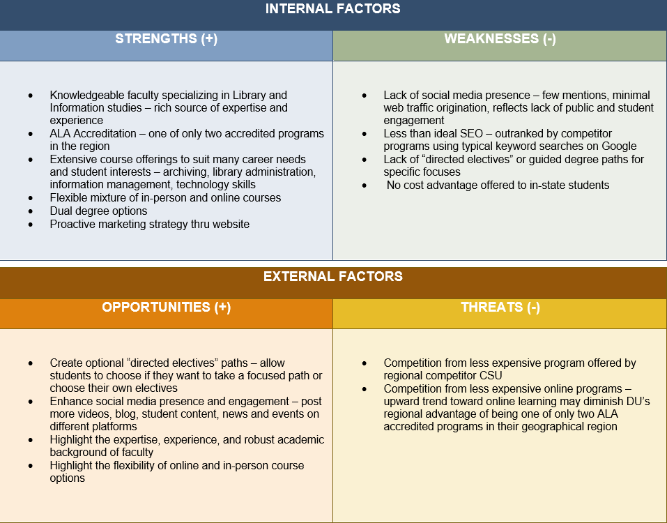 Below you will find a summary SWOT analysis of DU’s MLIS program based on the discussed findings.