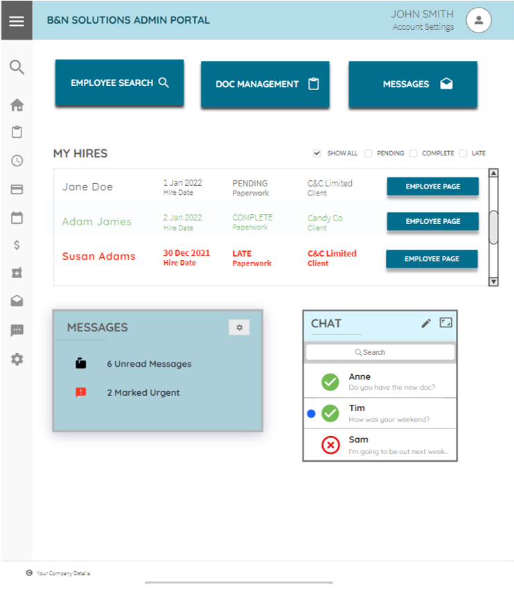 The Administrative and Recruiter Portal host similar designs. Below is an example of the homepage as seen by an On-Boarding Specialist. A side menu displays icons for different functionalities including Document Management, Timesheets, Expenses, Benefits, etc. At the bottom is a Messages Box that shows a summary of unread and urgent messages, as well as a Chat Box to communicate with internal staff.