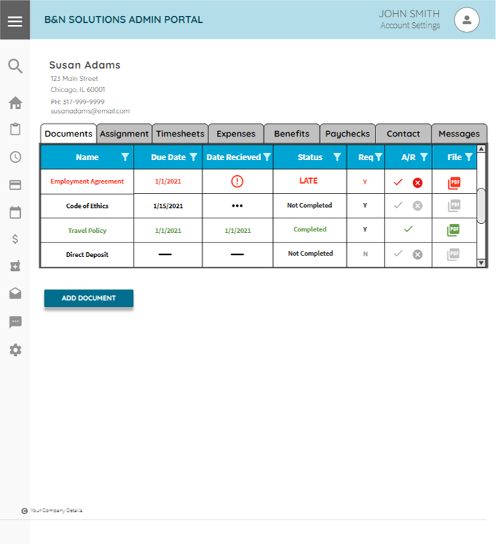 Once on an employee’s page, the user can view any missing or completed documents. Past due documents are displayed in red and completed documents in green. Each document row includes the document’s Name, Due Date, Date Received, Status, Req (Required – Yes or No), A/R (Accept/Reject) and File Icon. Once a document is completed, the user must click the check or “X” icon in the A/R (Accept/Reject) column. If the document is accepted the line item will turn green and the PDF icon in the File column will be activated, allowing the user to click and view the completed document.
