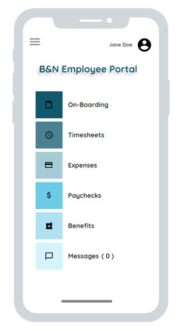 Below is an example of the Employee Portal homepage, where simple buttons using recognizable icons and textual labels inform the users of each button’s function. Colors from the same color family are utilized to create a clean and streamlined aesthetic, and can be customized based on a client’s brand needs.