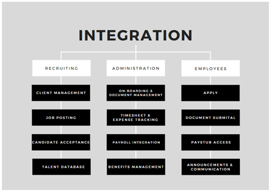 The platform’s key features can be categorized by the three main user groups: Recruiting, Administration, and Employee Services.